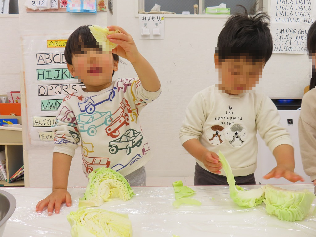 「みんなが剥いてくれたキャベツが入っているよ!」と言うと大きなお口を開けて食べるのを見せてくれて、とってもおいしくいただきました!