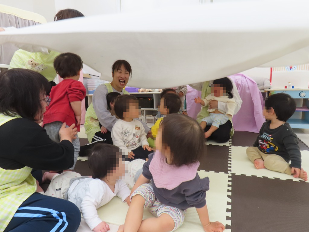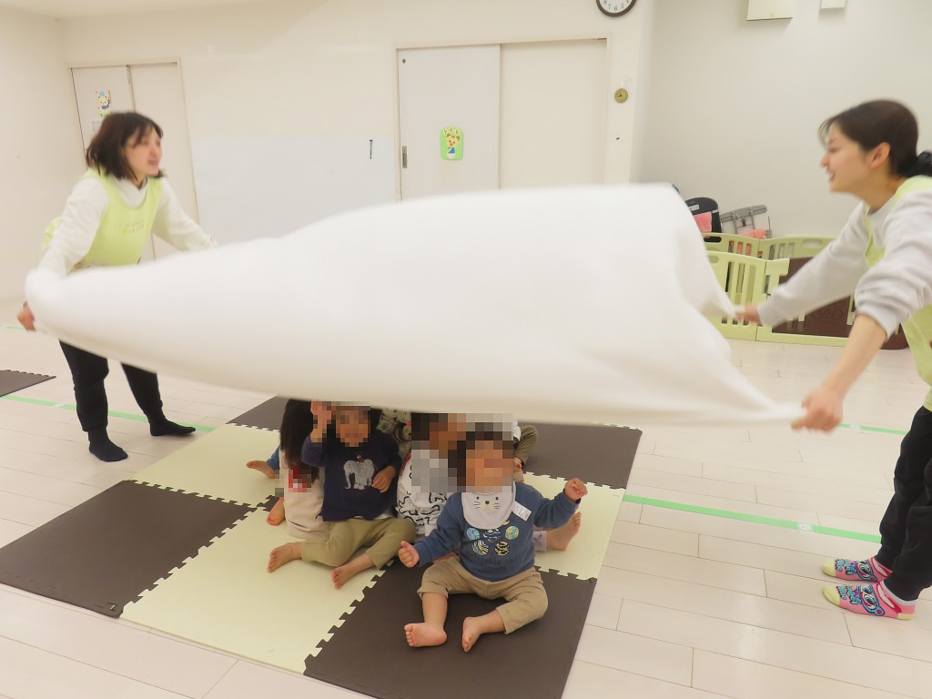 わらべうた”うえから したから”の歌に合わせて大布遊びをしました♪大布を勢い良く上げると、下から上に大風が来て、子どもたち、「きゃー!」と歓声を上げて大喜びでした!