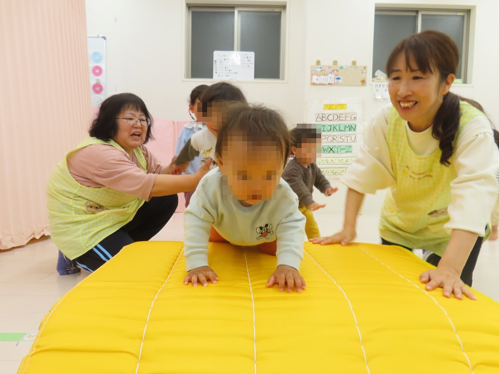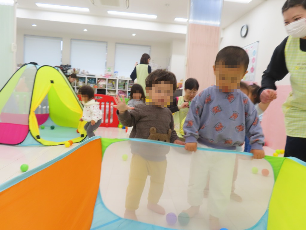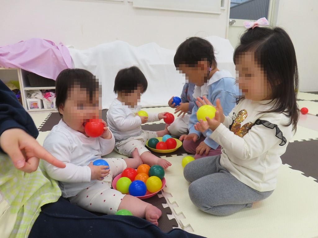 雨の日の設定あそびの一コマです♪進級児さんが新入園児さんのそばに来て見守ったり、「どうぞ」とボールを手渡し、ほっこりした雰囲気です♪
