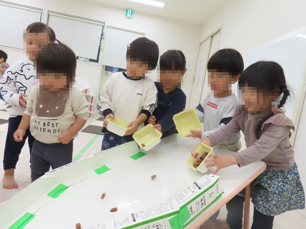 豪快に容器をひっくり返して転がしたり、一つずつ摘まんで転がしたり、転がってきたどんぐりを拾い集めるのを楽しんだり♪