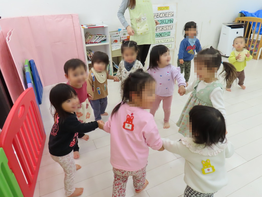 朝の体操では誰からともなくお友達同士手を繋ぎ始めて、いつの間にか子どもたち数人が集まって、手つなぎの輪を作り、楽しさに共感する姿がありました!!