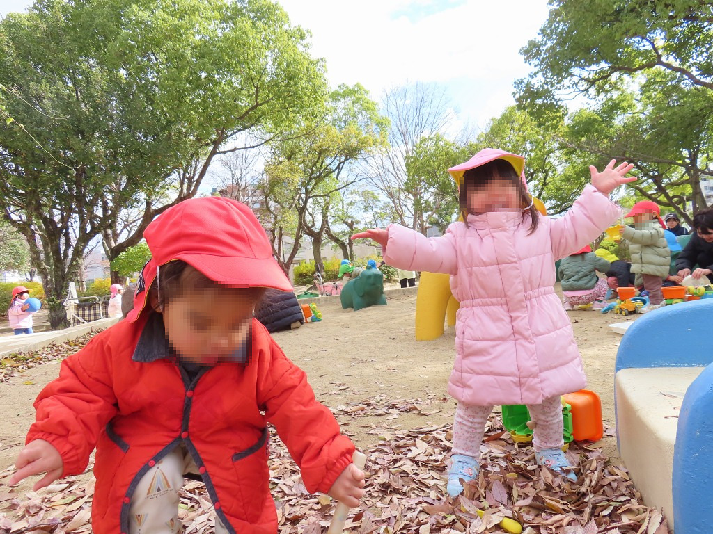 戸外ではお砂場の中に枯れ葉がこんもりと溜まっていて、足で踏んでカサカサの音や感触を楽しんだり、スコップですくってひらひら落ちるのを見て楽しんだり♪