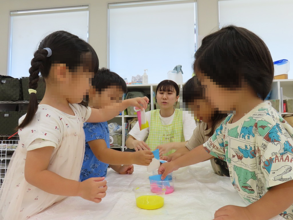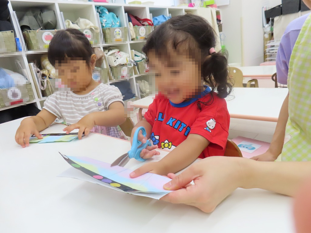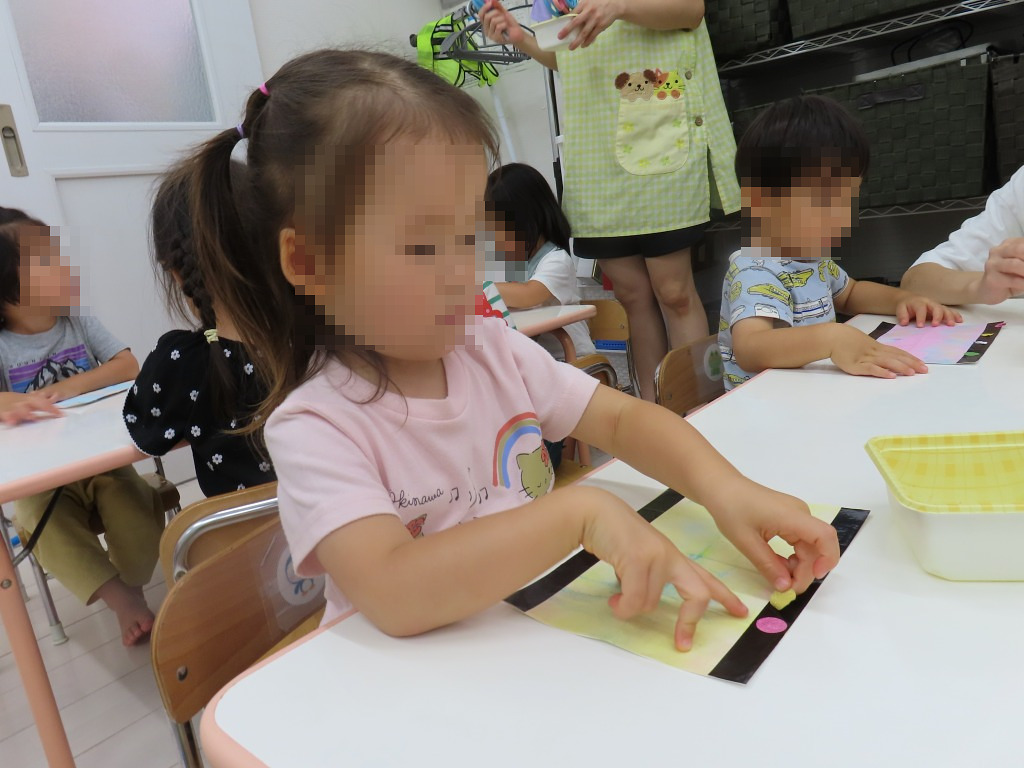 もうすぐウェリナの夏祭り♪そこでお祭りの雰囲気に欠かせない提灯を作る事にしましたよ。まずは障子紙を四つに折って好きな色の絵具液を染み込ませます♪広げてみると、にじんだ色のグラデーションがとても綺麗!乾かしてから、縁取りの部分に好きなシールを貼りました。赤組さんは、はさみの1回切りもしましたよ。