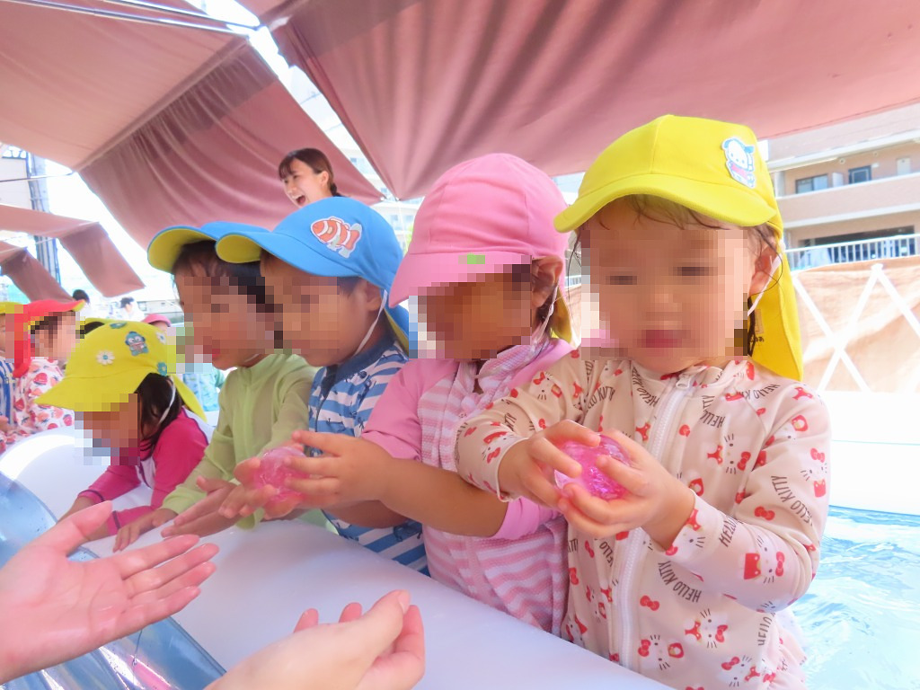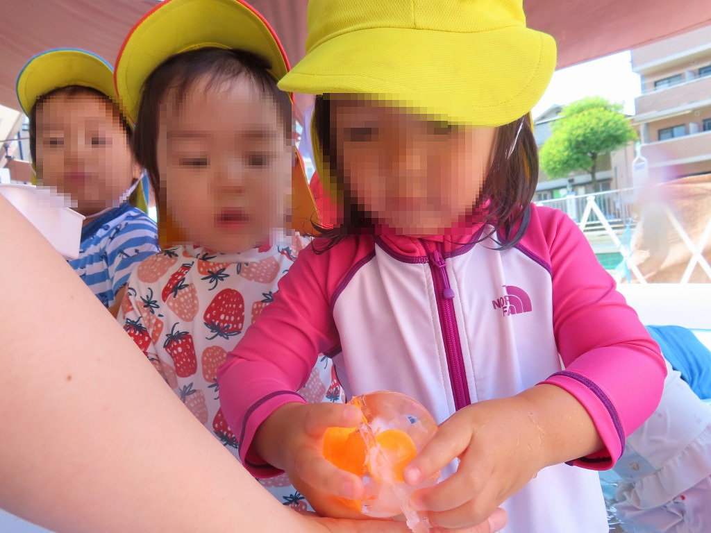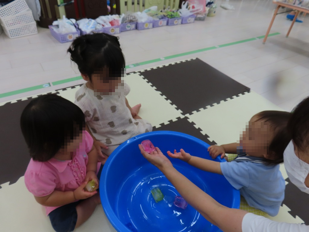 今回は丸や四角の氷に触れて、感触あそびを楽しみました。