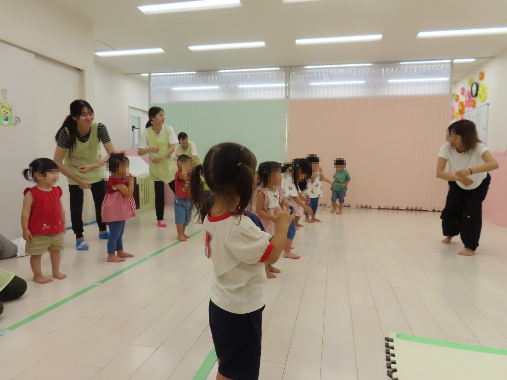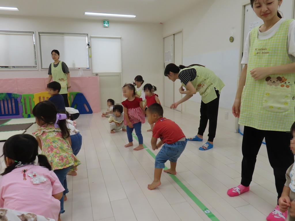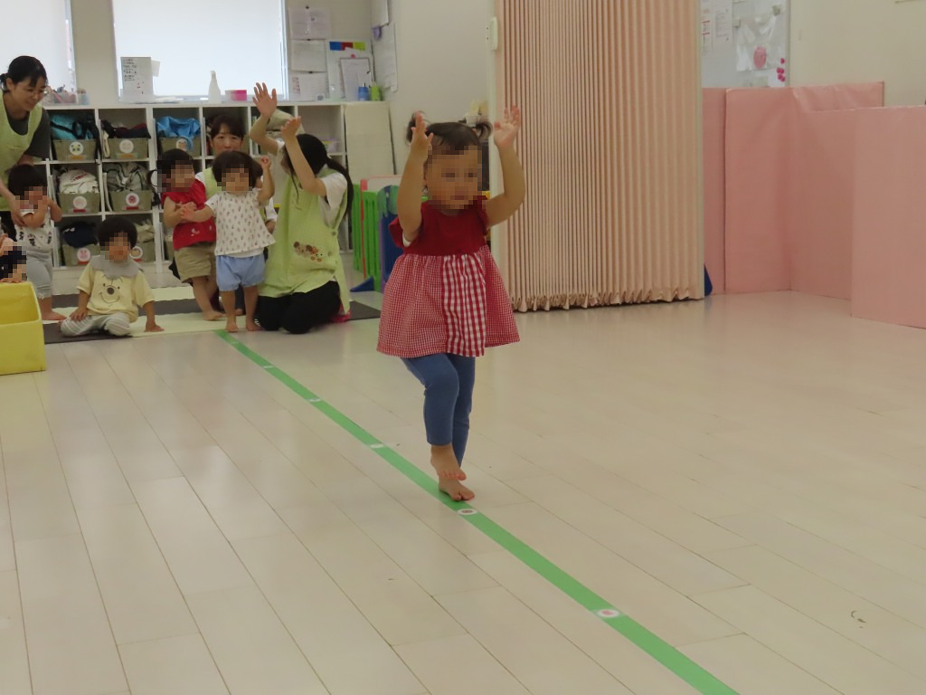 手を上にあげて手拍子しながら歩いたり、グーで手足をすぼめてパーで手足を広げることを繰り返し、両足ジャンプで前に進む動きもこなせるようになってきました!
