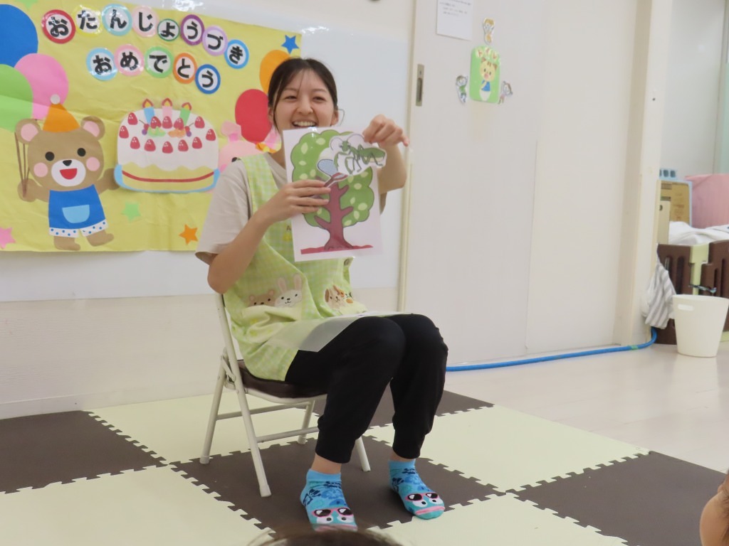 お誕生月のお友達が前に出て、木にとまっている虫さんを虫網で捕まえてくれましたよ。