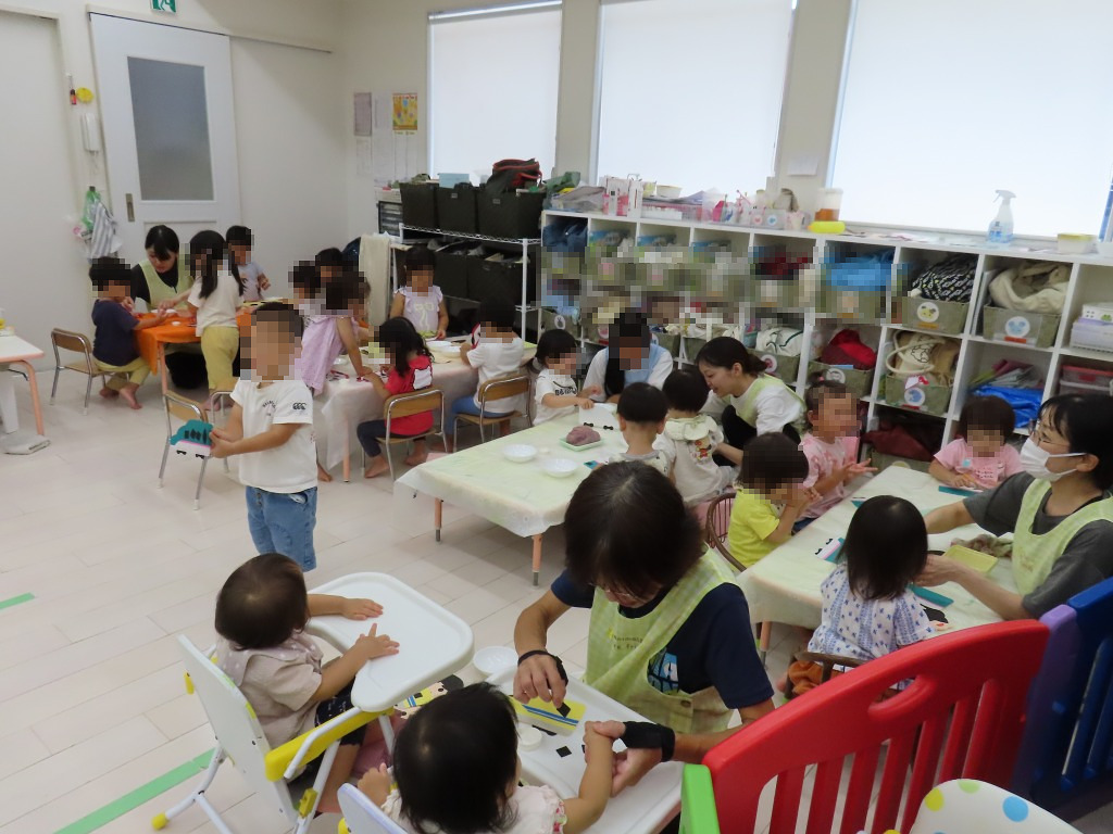 運動会の活動では旗を彩るアイテム、新幹線とお友達それぞれのお顔を作りました。ハイビスカスの周りを走る賑やかな旗の完成が楽しみです♪