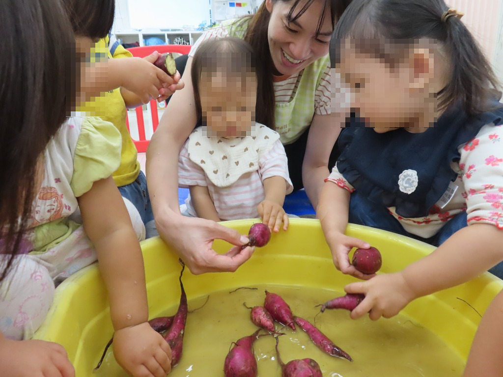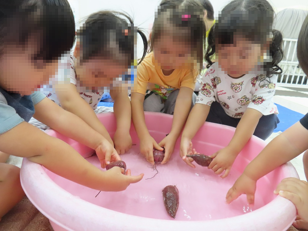 今日は芋掘りで収穫した芋をお調理の先生においしくお料理してもらおうと、みんなで芋洗いのお仕事をしましたよ♪