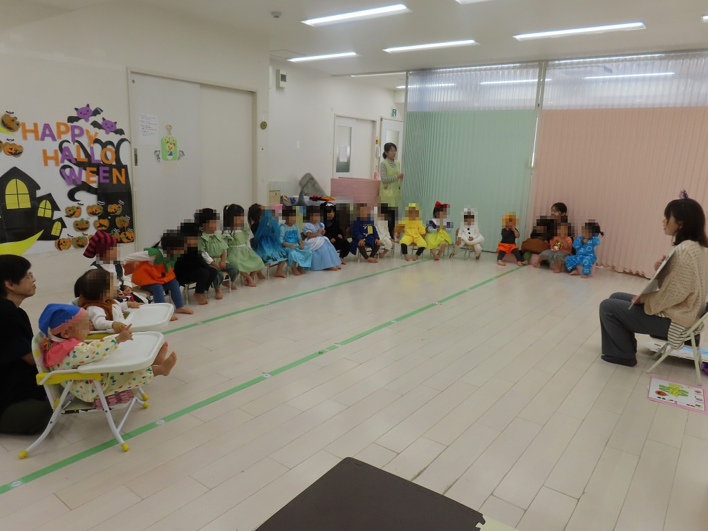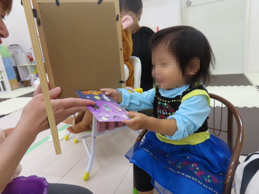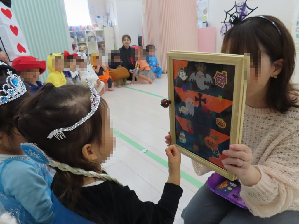 今日は楽しみにしていたハロウインパレードの日♪朝からわくわくが止まらない様子のお友達♪イベントのオープニングはECCプログラム♪大型絵本やカード遊びもとっても意欲的に参加していました。プログラムの終わりには素敵な扉に向かって「Torick or treat!」「Here you are!」