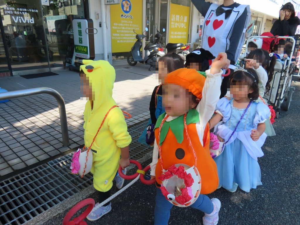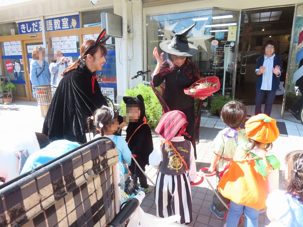 ハロウインバックを持って意気揚々と歩きます♪最初に訪れたのは美容室「CUT SALON LA・MODE」さん!「Trick or Treat!]」「happy Halloween!」魔女になって出迎えて下さいました!「はい!どうぞ!」「ありがとう!」わくわくした様子でお菓子を手にする子どもたち♪