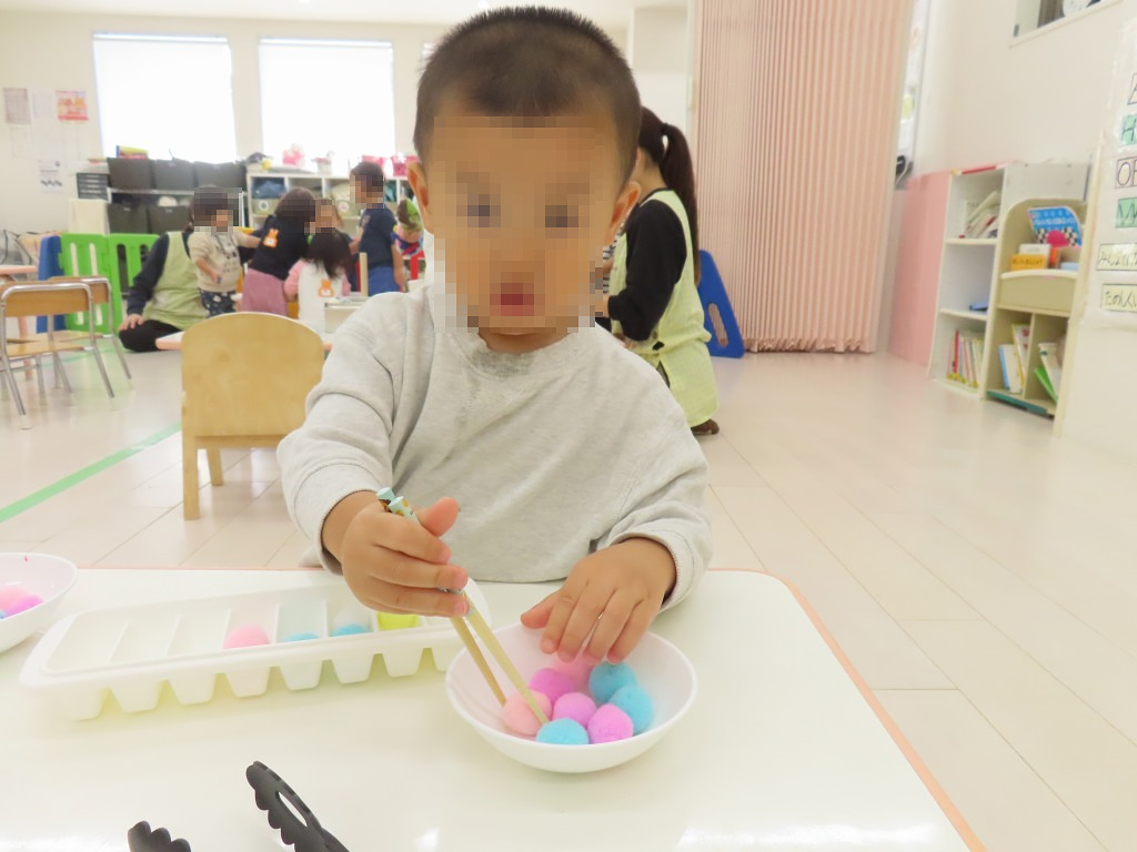 トングや箸を使った空け移し、紐通し、棒差し、洗濯ばさみあそびなど好きなあそびを選んで活動しています。