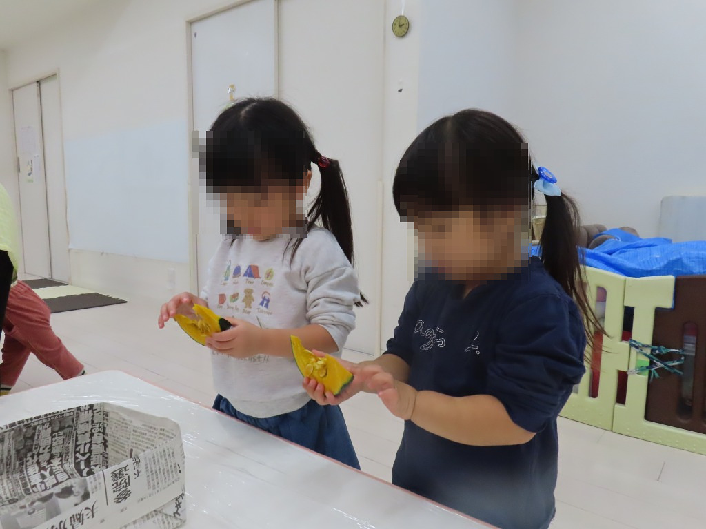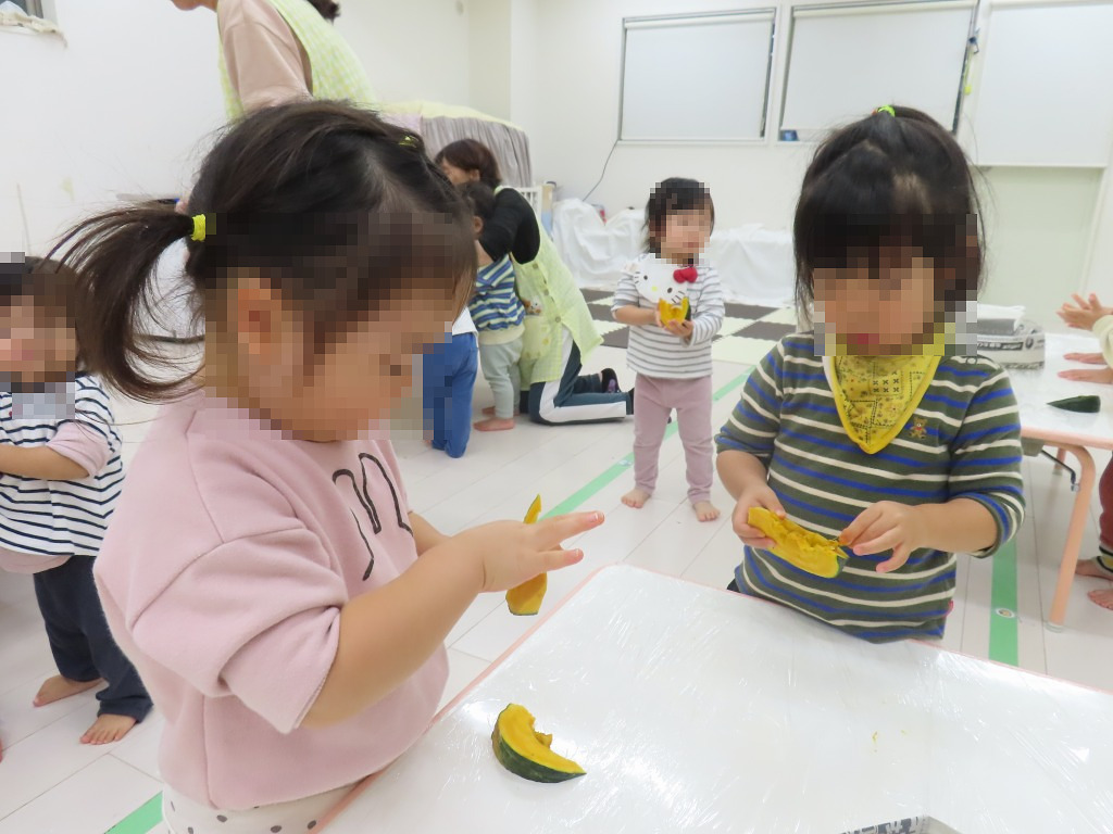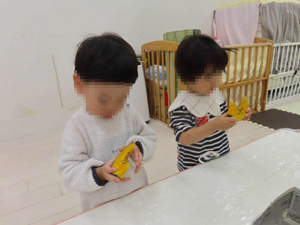 給食で味わうかぼちゃ煮物は格別だったようで、「おいしい!」と大好評でした!