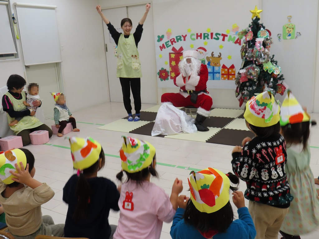 始めてみるサンタさんにびっくりしたり、満面の笑顔を見せたり、大興奮の子どもたちでした♪
