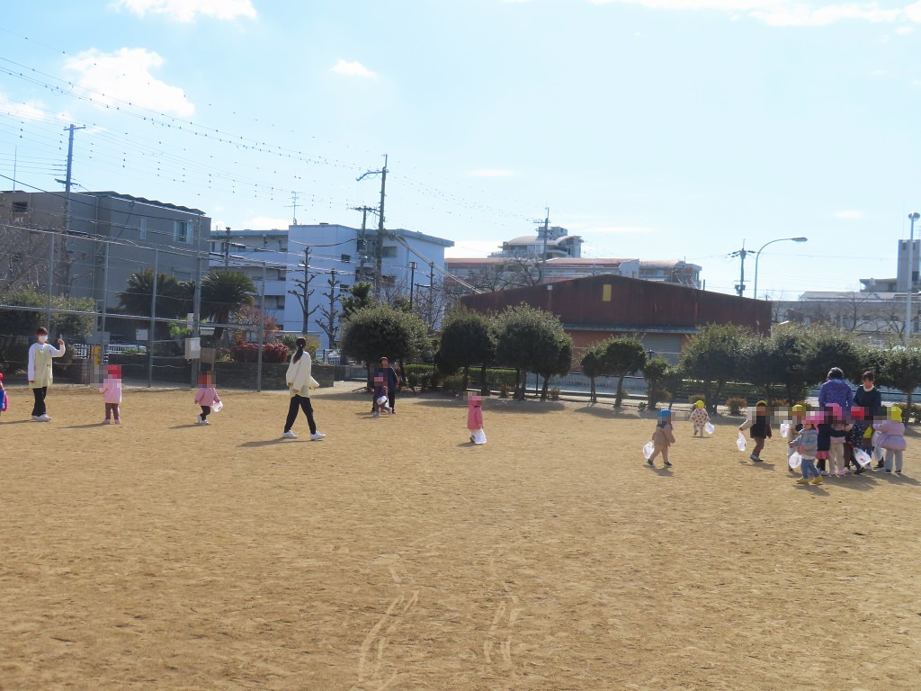 ビニール製の凧は風を受けてふわっと膨らみ、歓声を上げながら走ったり、保育士の後を追いかけたりして、思いっきり身体を動かして、冬のあそびを楽しみました!