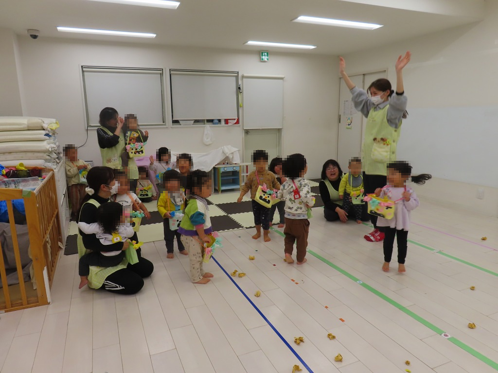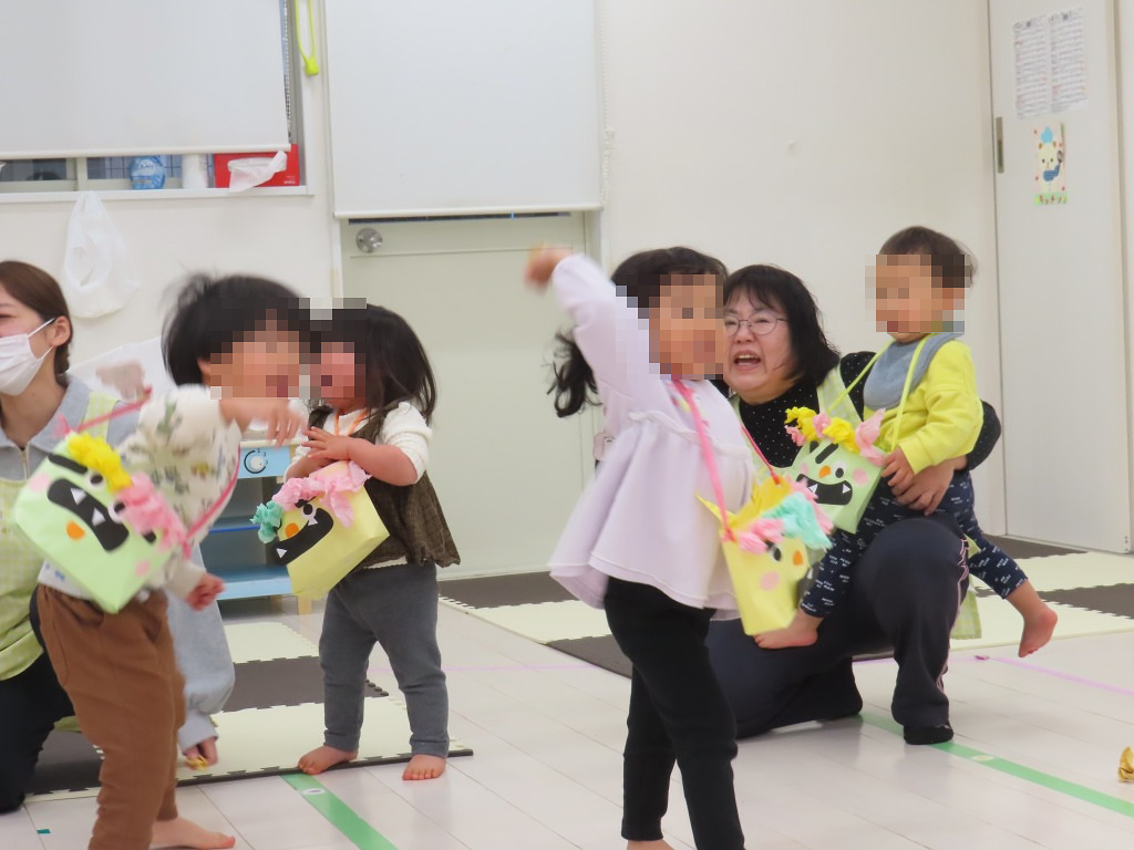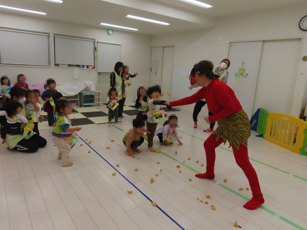 保育者の掛け声に合わせて鬼に近づき、果敢に豆を投げるお友達♪