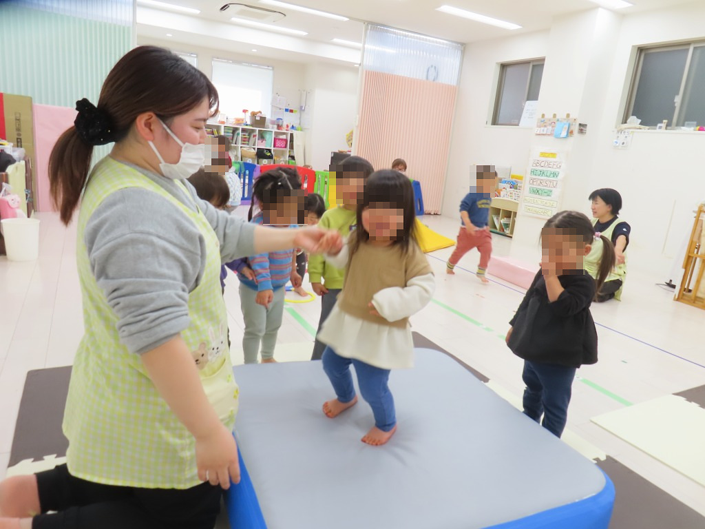 トランポリンは特に人気で豪快に跳ねてみたり、保育者と手を繋いで踏んだ感触を楽しんだり♪