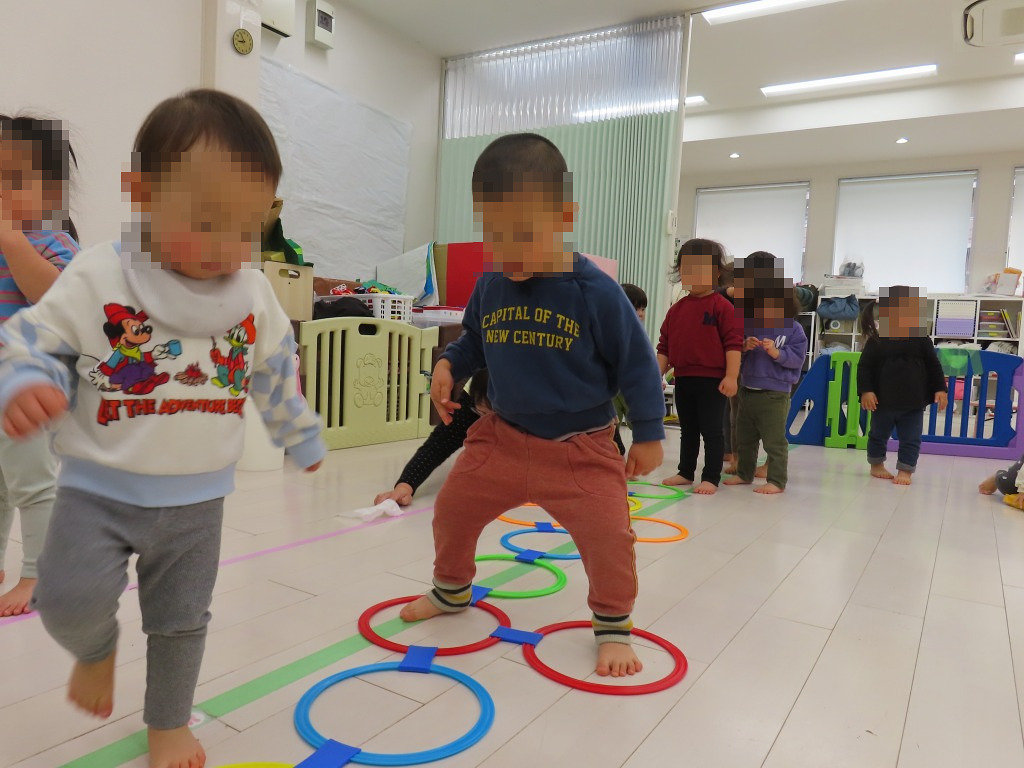腕や足を使ってはいはいで登ったり、フープの輪の中を歩いたり両足でジャンプしたり♪