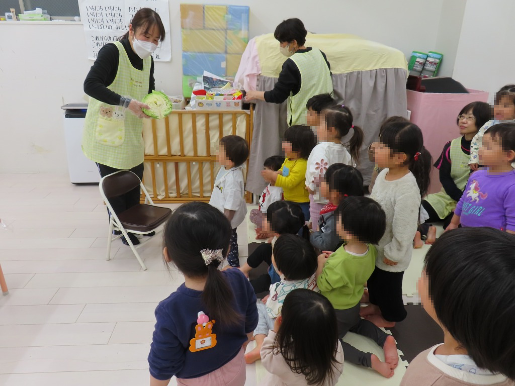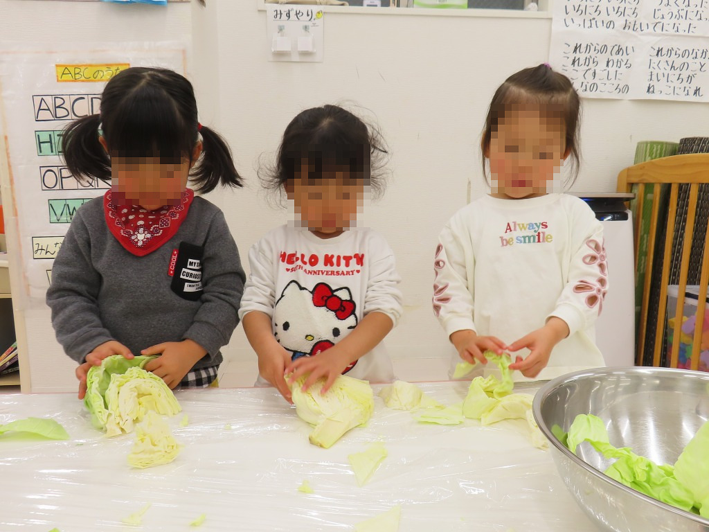 「みんなが剥いてくれたキャベツが入っているよ!」と言うと大きなお口を開けて食べるのを見せてくれて、とってもおいしくいただきました!
